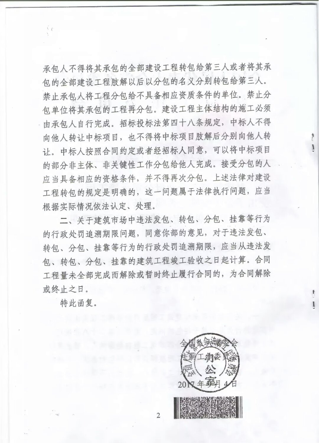 近日,住房與城鄉建設部向全國人大常委會法制工作委員會(下稱“全國人大法工委”)發出請示函,全國人大法工委作出《對建筑施工企業母公司承接工程后交由子公司實施是否屬于轉包以及行政處罰兩年追溯期認定法律適用問題的意見》(法工辦發[2017]223號,以下簡稱《意見》),其第一點認為: